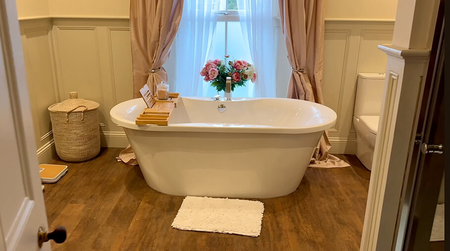 The master suite is especially generous. The roll-top bath alone is an invitation to pause. Deep, warm, restorative. The kind of bath you don’t rush. The kind that reminds you to slow your breathing.