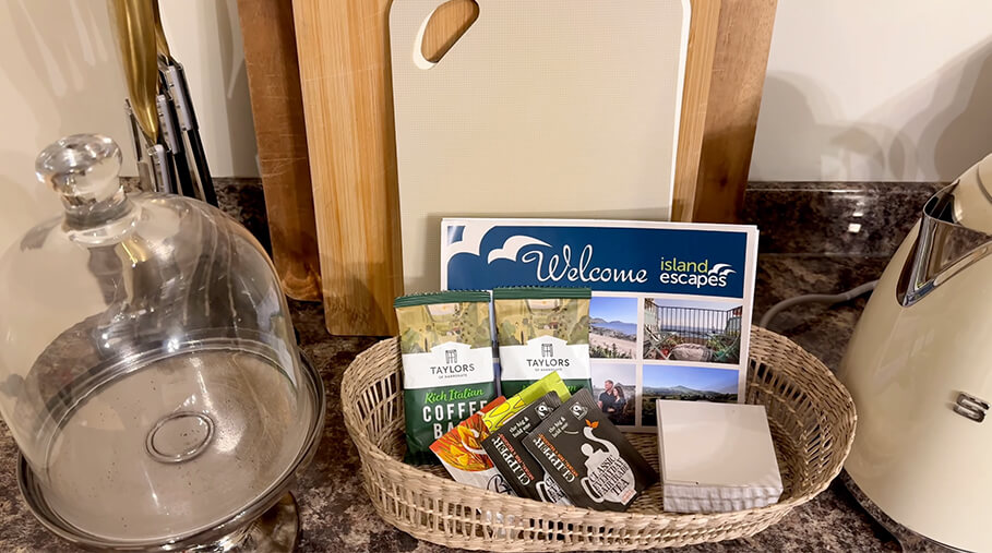 The kitchen is stocked with care. Tea, coffee, bread, milk, cheese. Enough to arrive, exhale, and make yourself comfortable without needing to rush out.